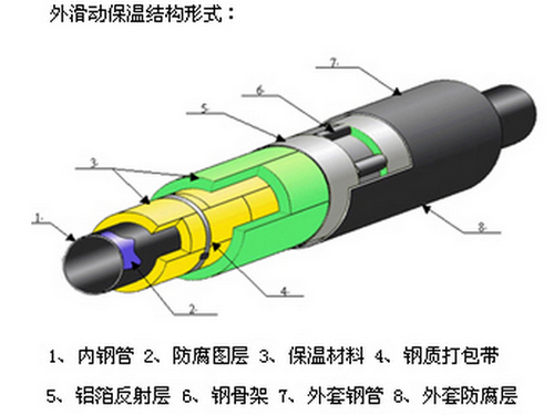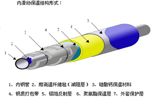1、內(nèi)滑動(dòng)式:保溫結(jié)構(gòu)由工作鋼管、硅酸鋁、減阻層、微孔硅酸鈣、隔熱層、不銹鋼緊固鋼帶、鋁箔反射層、聚氨酯保溫層、外套鋼管、外防腐層組成(基本已不使用)。